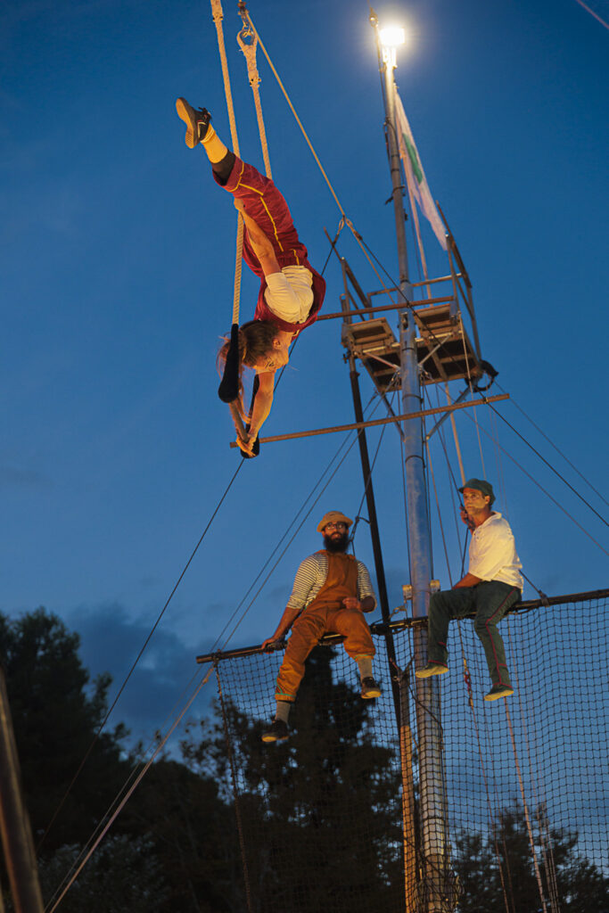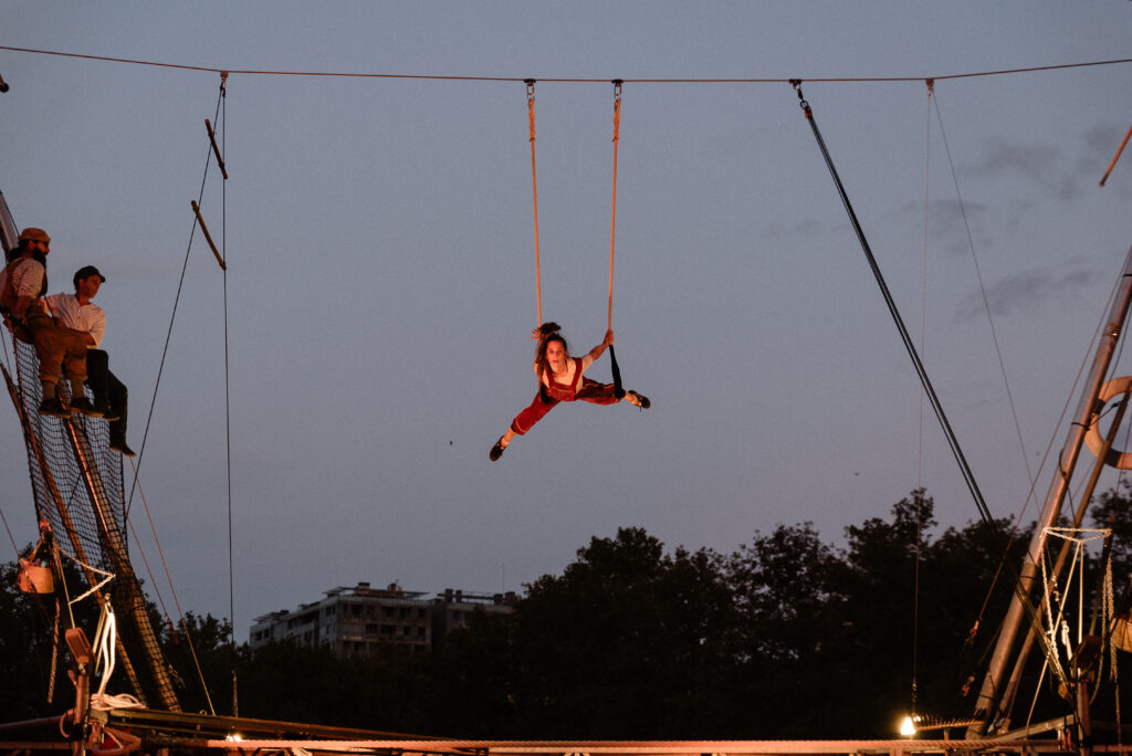 Un insólito barco tiende un hilo a 7 metros de altura, trapecio, mástil chino y red aérea. Un peculiar tripulación compuesta por 3 acróbatas y 2 músicos. Un desafío a la gravedad, una invitación a soñar, ilusionarse y dar rienda suelta a la imaginación.